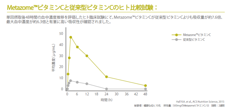 弊社ではこの度、インドのリポソーム製品製造会社であるMolecules Bio Labs社の販売代理店として、70~72%のビタミンCが含有されたMetazome™ビタミンCの取り扱いを開始致しました。本原料は、特許取得済みのリポソーム技術により、有効成分をナノサイズで均一に包み込み、吸収効率を大幅に高めた原料です。ヒト臨床試験においては、一般的なビタミンCと比較して約7倍以上の吸収量が確認され、権威ある学術誌“ACS Nutrition Science”に掲載されています。