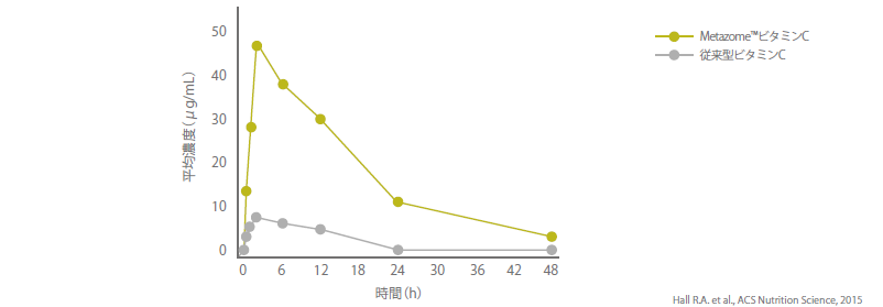 単回摂取後48時間の血中濃度推移を評価したヒト臨床試験にて、Metazome™ビタミンCが従来型ビタミンCよりも吸収量が約7.6倍、最大血中濃度が約6.3倍と有意に高い吸収性が確認されました。